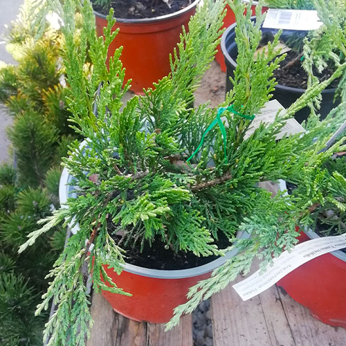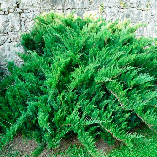 Раскидистый кустарник с прямыми, горизонтально расположенными, часто восходящими ветвями высотой до 1,0 метра (макс до 1,5 м) и диаметром кроны около 2 метров и более. Благодаря укоренению лежащих на поверхности почвы ветвей быстро разрастается в ширину. Хвоя яркая, голубовато-зеленая, в основном игловидная, по 3 в мутовке, слегка изогнутая, тупозаостренная, с белой полоской сверху.
